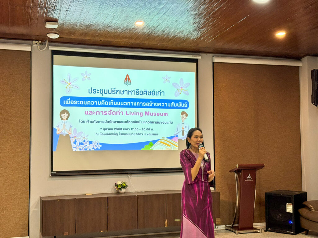 เมื่อวันที่ 7 ตุลาคม 2568 ฝ่ายกิจการนักศึกษาและนวัตวณิชย์ มหาวิทยาลัยขอนแก่น จัดประชุมปรึกษาหารือศิษย์เก่า เพื่อระดมความคิดเห็นเกี่ยวกับแนวทางการสร้างความสัมพันธ์ระหว่างศิษย์เก่า ศิษย์ปัจจุบัน และมหาวิทยาลัย รวมถึงแนวคิดในการจัดทำ Living Museum หรือพิพิธภัณฑ์มีชีวิต ซึ่งเป็นแนวทางใหม่ในการสื่อสารอัตลักษณ์และประวัติศาสตร์ของมหาวิทยาลัยผ่านเรื่องราวและประสบการณ์ของศิษย์เก่า