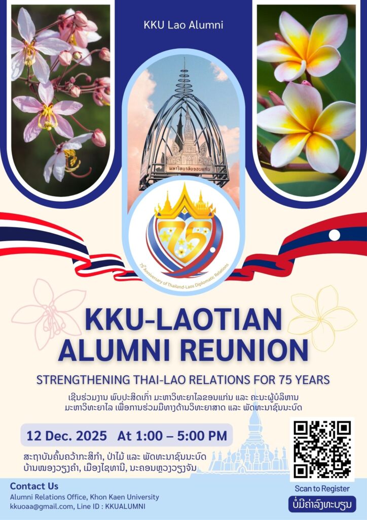 On the auspicious occasion of the 75th Anniversary of Thailand-Laos Diplomatic Relations, Khon Kaen University (KKU), in collaboration with KKU alumni in Lao PDR, cordially invites all KKU Laotian alumni to join the “KKU–Laotian Alumni Reunion: Strengthening Thai-Lao Relations for 75 Years” to strengthen bonds and exchange valuable experiences between alumni from both nations.